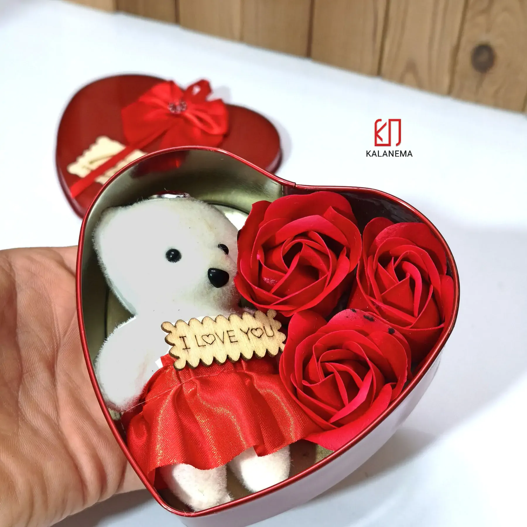 جعبه فلزی قلبی، خرس فومی بامزه و رزهای قرمز که کار هدیه دادن رو برات راحت میکنه. مناسب ولنتاین، تولد یا سورپرایز عاشقانه